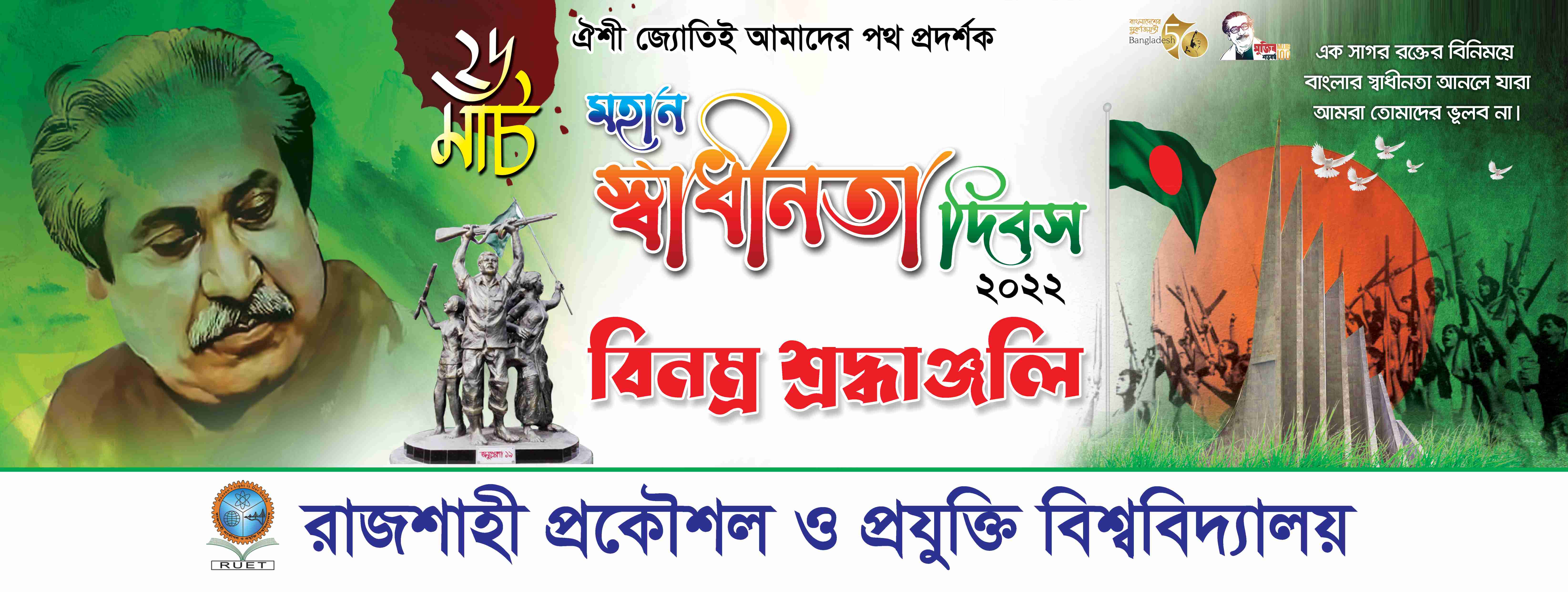 আসসালামুআলাইকুম। মহান স্বাধীনতা এবং জাতীয় দিবস-২০২২ উদযাপন উপলক্ষে সকল শিক্ষক, কর্মকর্তা, কর্মচারী ও ছাত্র-ছাত্রী-কে কর্মসূচীতে অংশগ্রহণের জন্য অনুরোধ করা যাইতেছে।